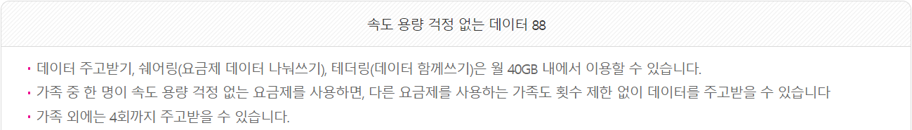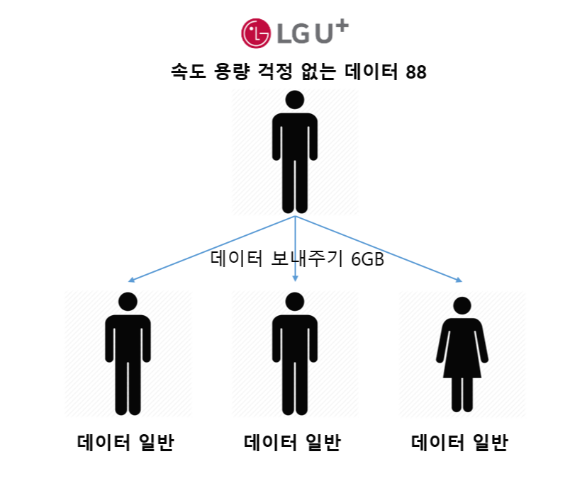 간단히 말하면 한 명이 고요금제를 사용하고 다른 가족들은 기본요금제를 사용하면서 고요금제(속도 용량 걱정 없는 데이터 88)를 사용하는 사람이 다른 가족들에게 보내주는 방법이다.