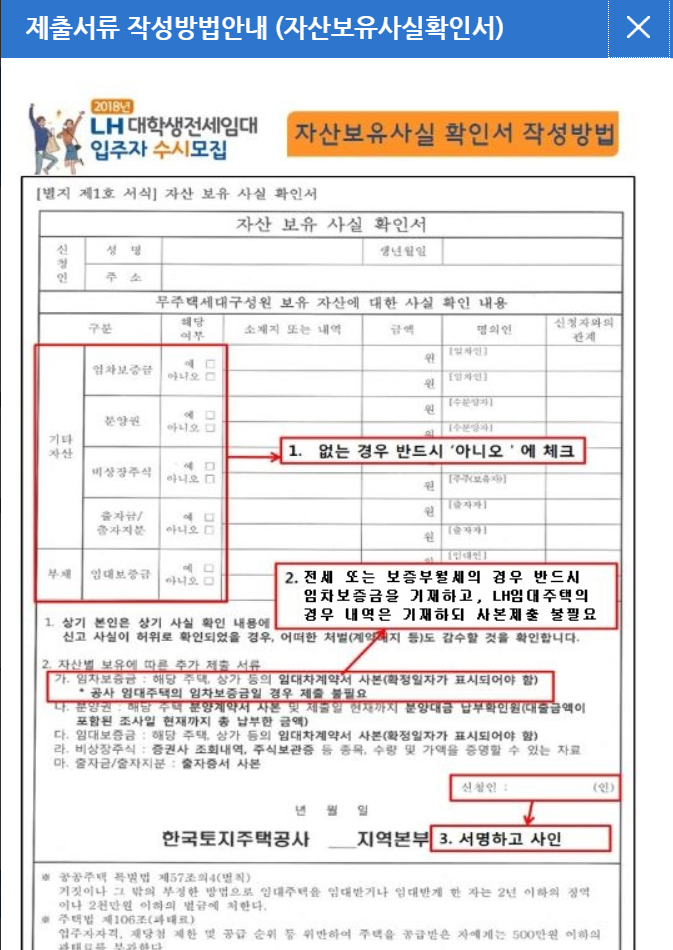 - 자산보유사실 확인서: 빨간색 부분이 중요한데, 요약하면 월세든 전세든 내 이름으로 사는 정보를 기입하라는 것이다