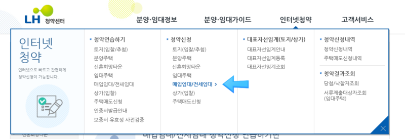공인인증서로 로그인 후, 인터넷청약 > 매입임대/전세임대 클릭!