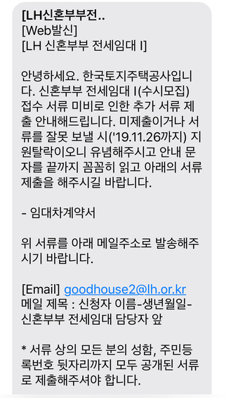 LH에서 심사하는데 필요한 서류인데 빠진 게 있는 경우 문자를 통해 친절하게 알려준다.