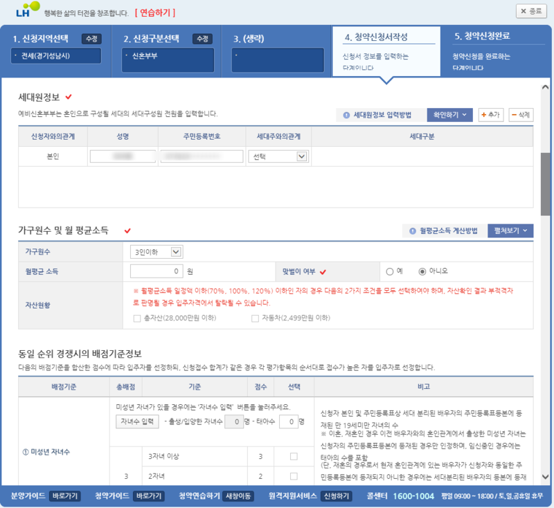가구원 수와 월평균 소득을 잘 작성하고, 자산 현황도 체크합니다.