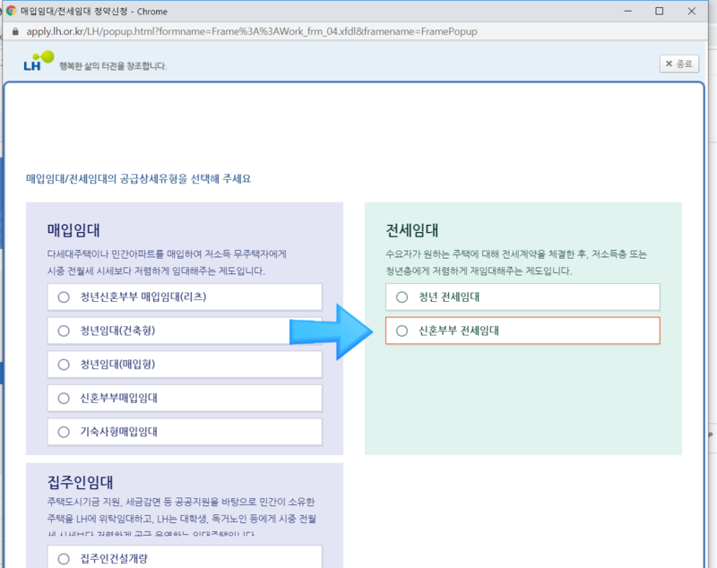 그러면 팝업창이 뜨는데 여기서 전세임대 > 신혼부부 전세임대 선택한다.
