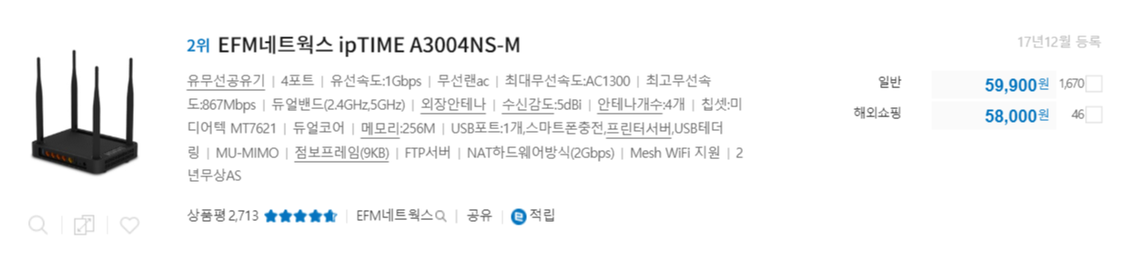 그래서 바로 검색해서 iptime에서 정말 잘나가는 A3004NS-M 제품을 구매하기로 합니다.